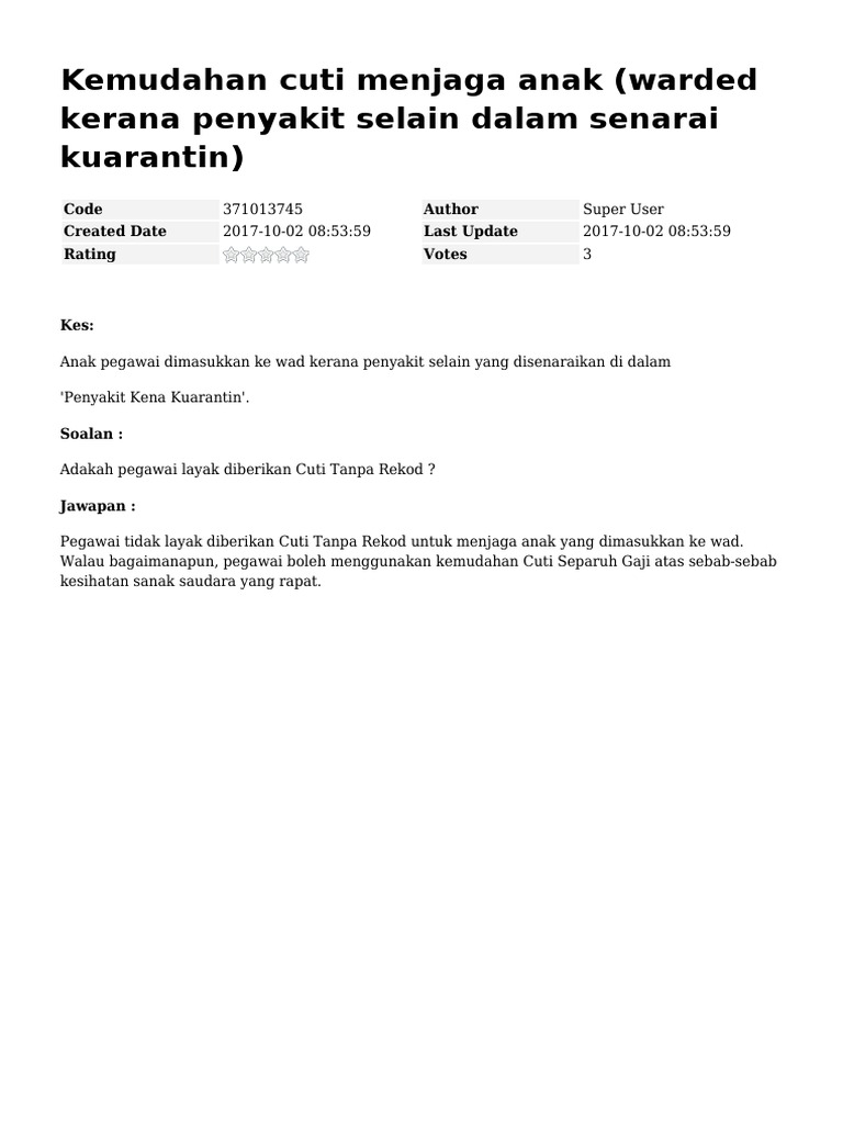 Ramai yang tak tahu dan tanya camna nak cuti tanpa gaji menjaga anak. Cuti tanpa gaji kerana menjaga anak selepas cuti bersalin tidak ditolak tempoh genap tahun perkhidmatan merujuk kepada pp 15 2007 kemudahan cuti menjaga anak layak pergerakan gaji bagi cuti tidak melebihi 180 hari dalam tahun kelender. 7 9 2008 2 25 00 am company. Hari yang ke 61 91 uolls tak boleh datang kerja.