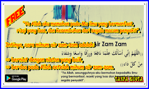 Doa minum air zam zam untuk obat. Inilah alasan mengapa doa ketika minum air zam zam menjadi doa yang mustajab mudah untuk diijabahi allah swt. Niat dan doa para ulama saat minum air zam zam. Ke mekkah umat muslim selalu menyempatkan diri untuk membawa air zam zam untuk keluarga. Teks bacaan lafadz doa minum air zam zam yang benar dalam bahasa arab latin dan terjemahan indonesia untuk obat wajah berjerawat lengkap beserta keutamaan minum air zam zam.