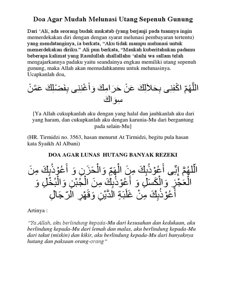 Doa melunasi utang berdasarkan hadis riwayat tirmidi nomor 3563 dari ali ada seorang budak mukatab yang mendatanginya ia berkata aku tidak mampu melunasi untuk memerdekakan diriku. Doa cepat kaya dan lunas hutang kaya dan tidak mempunyai hutang merupakan impian semua orang. Utang piutang adalah bagian yang tak bisa dipisahkan dari kehidupan manusia. Setelah muaz bercerita pada rasulullah kemudian sang rasul berkata aku ajarkan kepadamu.